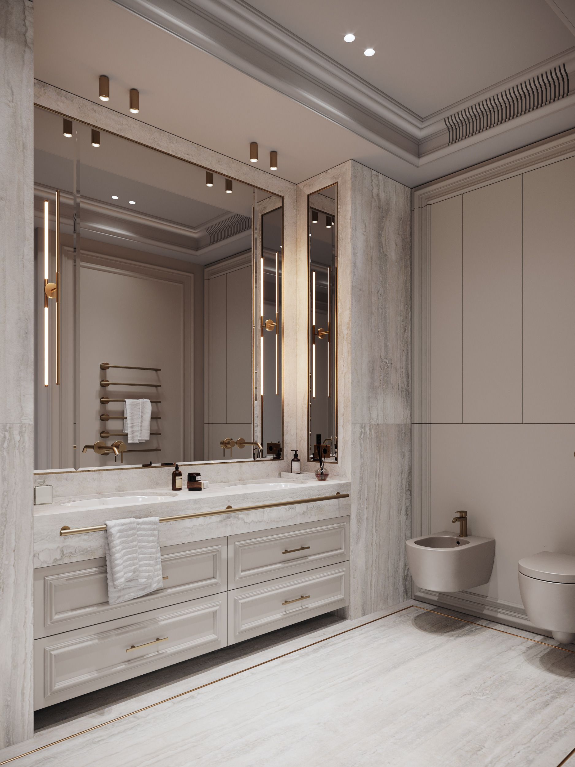 Tân cổ điển không chỉ tập trung ở các khu vực chức năng chính. Ngay cả phòng tắm và nhà vệ sinh cũng rất được đầu tư và chú trọng. Phòng tắm tân cổ điển pha trộn hoàn hảo giữa nét đẹp kiến trúc cổ điển trên tinh thần vẫn giữ nguyên các đường nét và thiết bị hiện đại. Từ đó khiến cho không gian thêm phần đồng điệu và hài hòa, thống nhất. Nhờ vào sự sáng tạo không giới hạn, diện mạo mới của những căn phòng tắm tân cổ điển đã có thể tương tự như các phòng tắm khách sạn cao cấp.